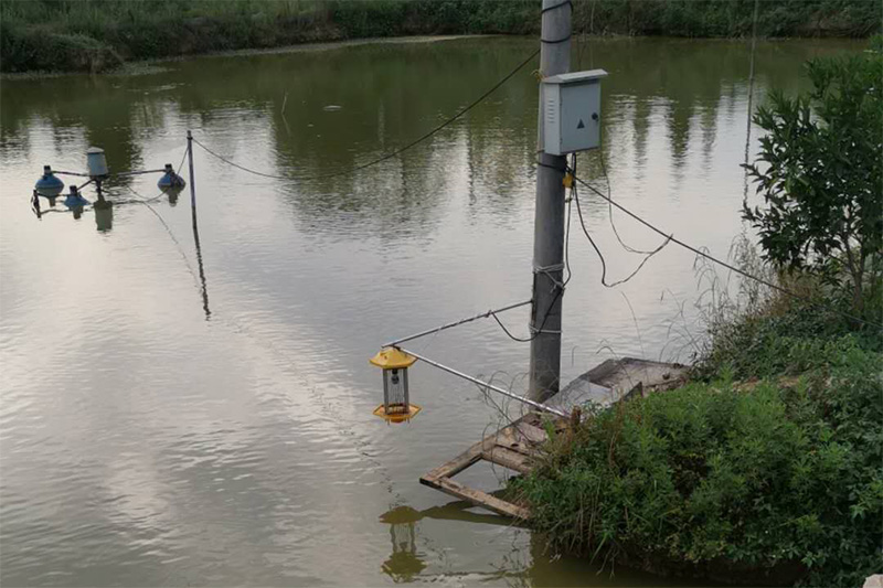 ▲魚塘使用交流電殺蟲燈誘蟲喂魚